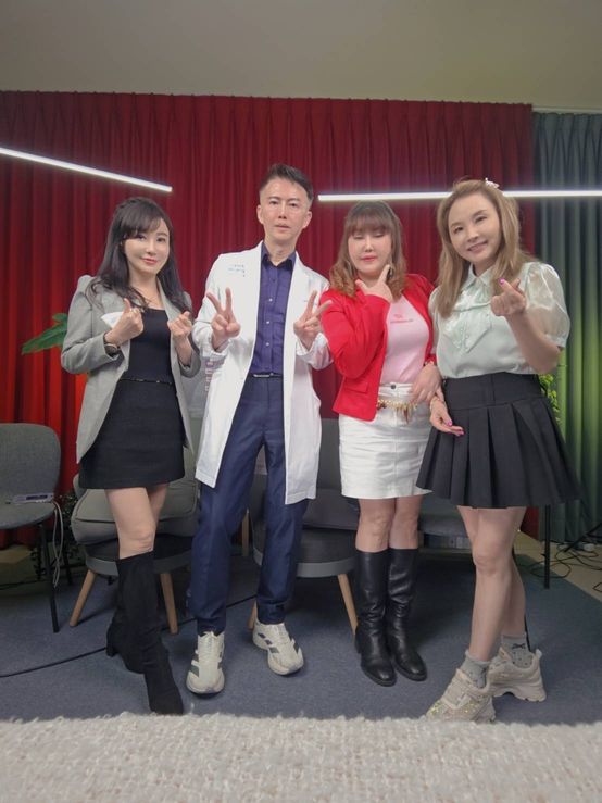 陽光璨亮生醫創辦人莊斯棋(左起)和陽光燦亮醫學整形診所院長蔡豐州與客服部經理蘇郁惠(小喬經理)在許聖梅節目大聊醫美最新趨勢。